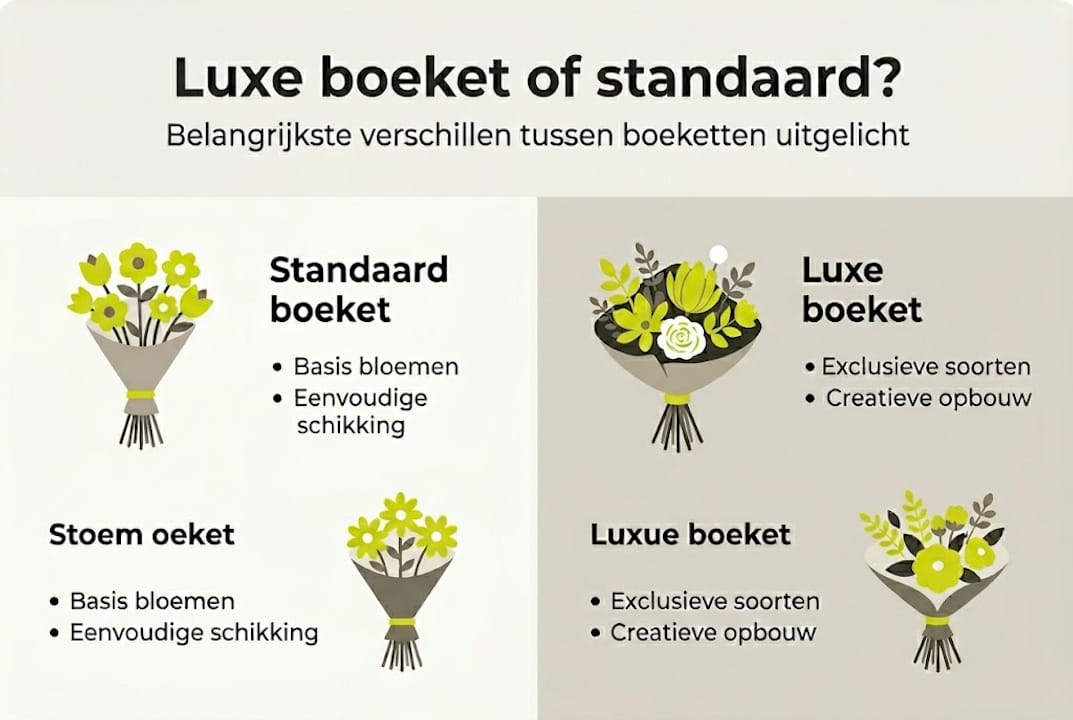 Nu de kenmerken van luxe boeketten duidelijk zijn, is het goed te weten hoe ze zich praktisch onderscheiden van standaard boeketten. Het verschil zit niet alleen in de prijs, maar in een combinatie van factoren die samen de totaalervaring bepalen.