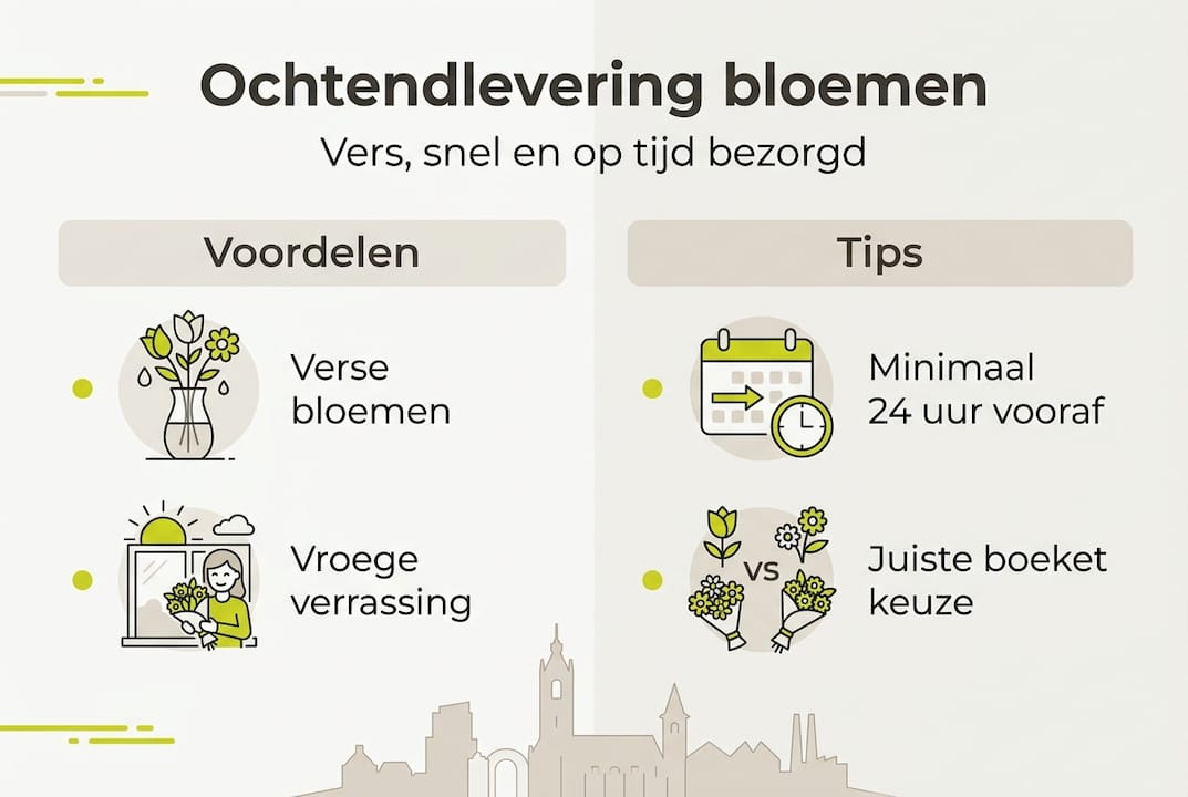 Ochtendlevering vereist vooruitplanning. De meeste bloemisten hebben een deadline van 24 tot 48 uur voor vroege leveringen. Last-minute bestellingen zijn zelden mogelijk vanwege de logistieke complexiteit.