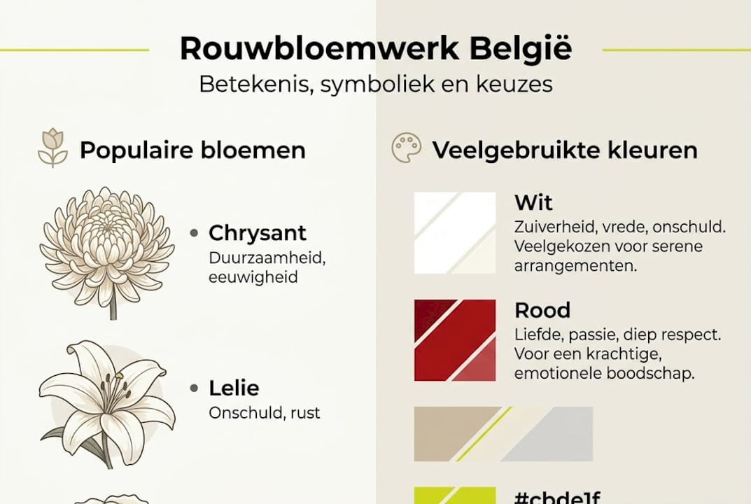 | Typische bloemen | Chrysanten, lelies, rozen en anjers zijn in België het meest gekozen bij uitvaarten en herdenkingen. |
