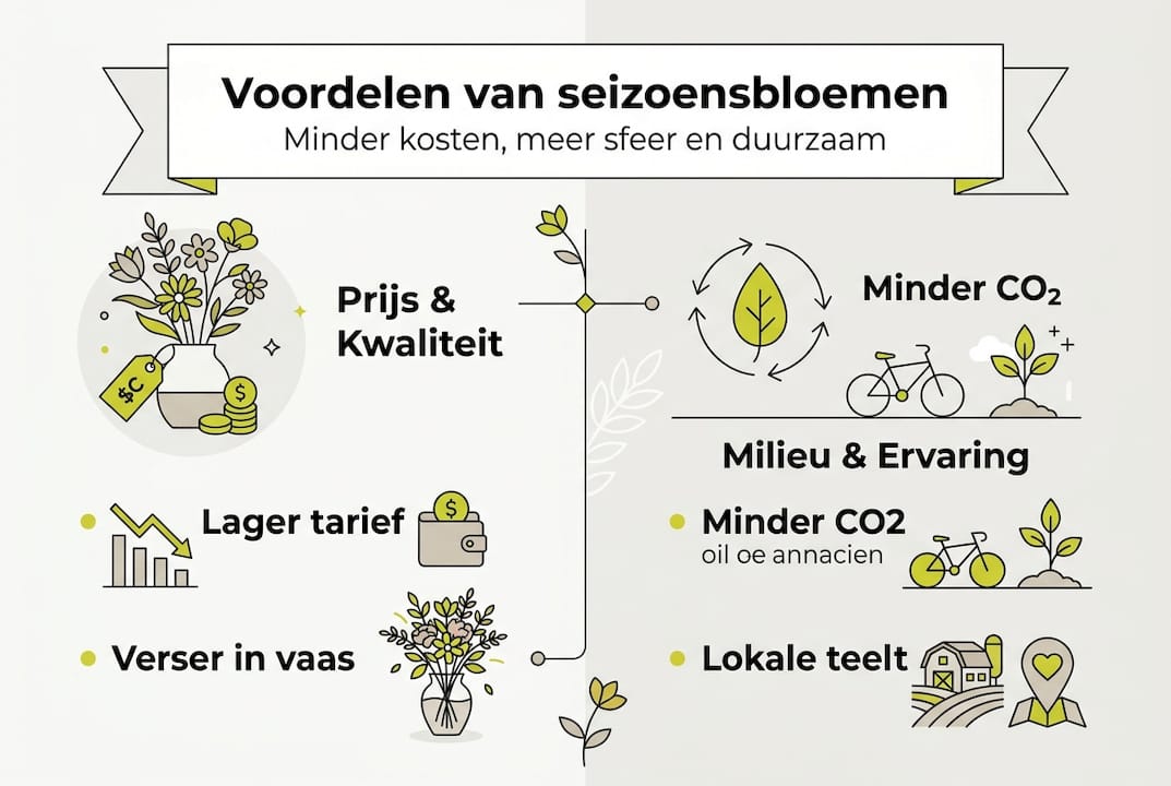 Het prijsvoordeel is duidelijk. Seizoensbloemen zijn goedkoper omdat ze in grote hoeveelheden beschikbaar zijn. Je betaalt dus minder voor een mooiere, versere bos.